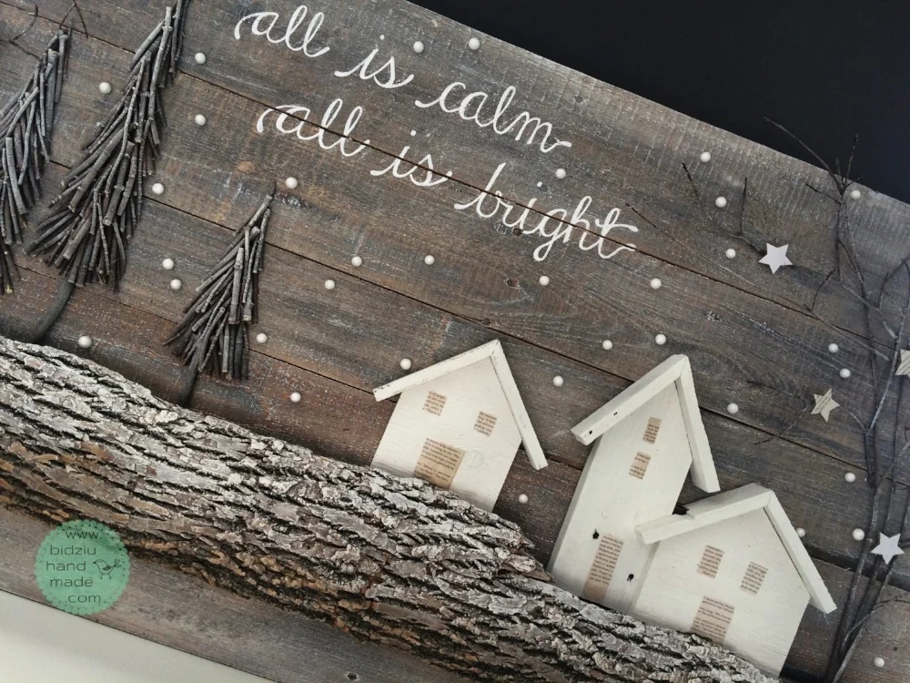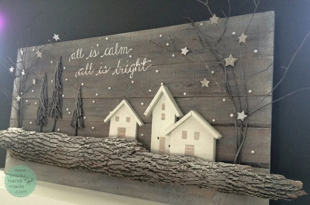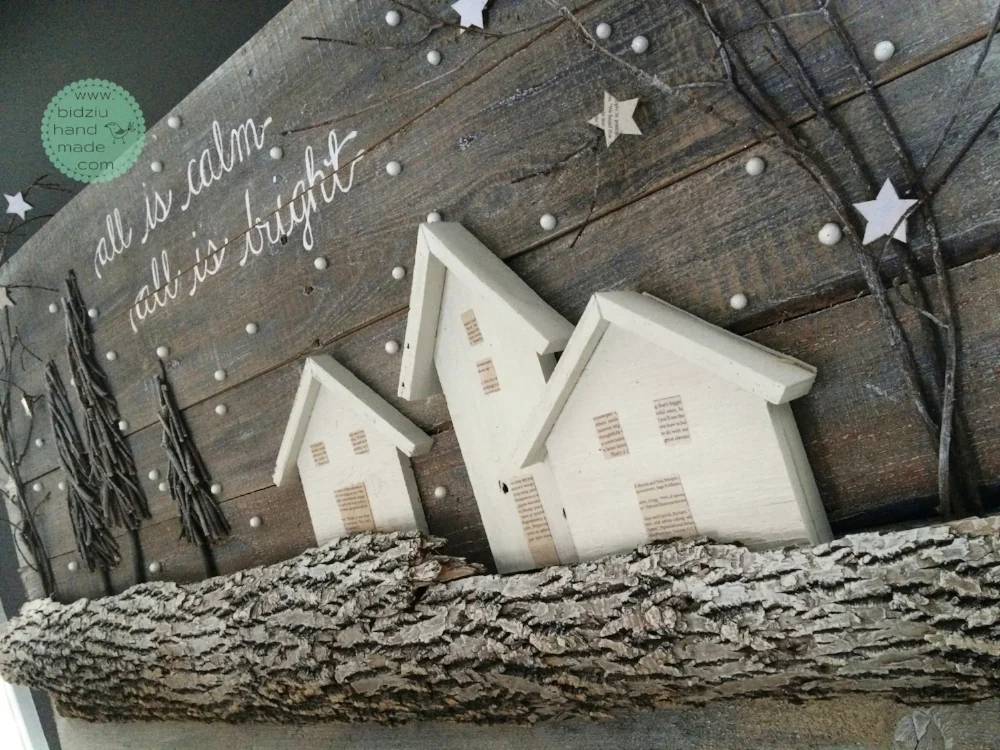 To make this piece, I began by grey and white dry brushing the largest wood pallet I had (27" x 50"). The wood was pretty new and it looked really fresh. I had to be really generous with my paint as I only wanted a little bit of the natural yellow wood colour to peek through. I then put some scrap pieces of wood to good use (I knew it was smart to hoard them all this time!) and cut out three houses, each a different shape and size. I painted them white. Next, I stained a few magazine pages with black tea to give them that aged, dark beige colour. Once the pages were dry, I cut out a few squares and rectangles and glued them on the houses to represent windows and doors. Next, I made the trees by breaking thin branches (also from the forest) to desired sizes and stacking/gluing them onto the pallet until I was happy with the size of each tree. I lightly dry brushed the tree tops in white to give the appearance of being covered in snow. Then, the houses were adhered to the pallet. To frame the entire scene, I glued a couple of curvy branches on each end of the pallet. I cut out a few stars from the tea-stained paper and attached them to select branches. I had a twig of white foam "berries" left over from another project, so I picked off the foam balls and individually placed them randomly throughout to represent falling snow. Finally, I dry brushed in white a large piece of tree bark (another treasure from the forest!) along the edge that would be the top of the "ground" in the scene and glued it down into place. To finish off the piece, I used a fine paint brush to paint on (free hand) a portion of the lyrics from "Silent Night".