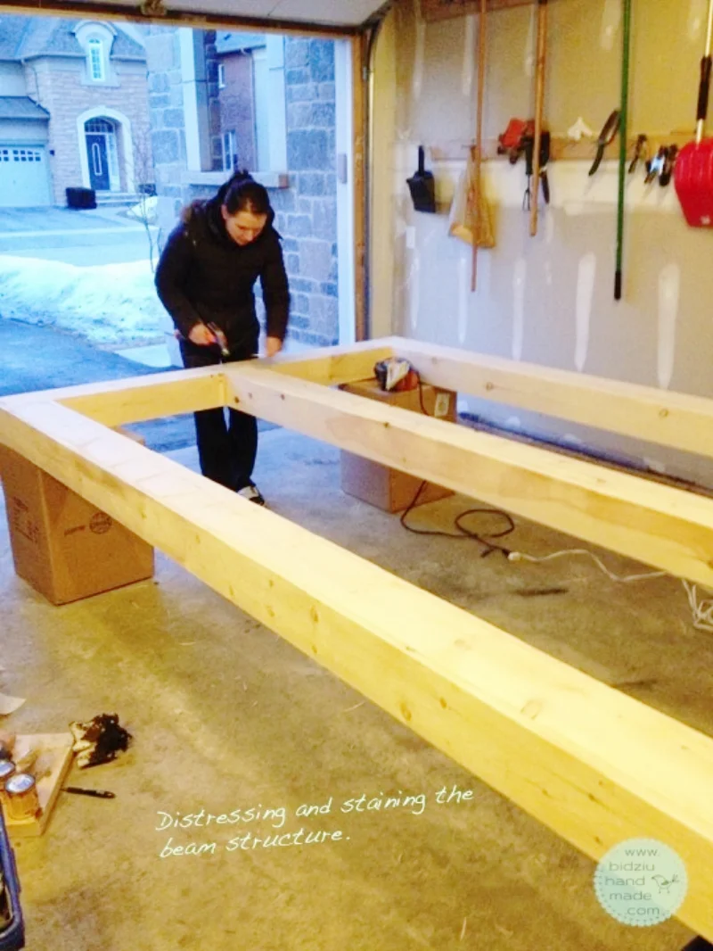 After filling in all screw holes with wood filler and sanding these areas down, I distressed the beams. To do this, I used various tools, but my favourite turned out to be a fork, serrated knife, metal potato masher, hammer, and long screws. Next, I stained the beams in a medium-dark walnut colour. Finally, my brother in law, an electrician by trade, wired our new light fixtures.