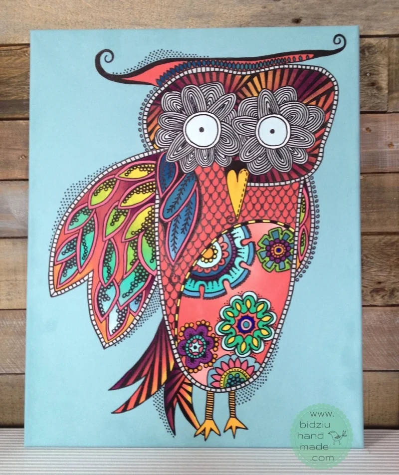 I studied various owls in particular that Davies had drawn and I incorporated the elements that I liked best from each into my own drawings. I used bright colours in different shades on the owls and added colourful backgrounds to create cheerful and distinct canvases.