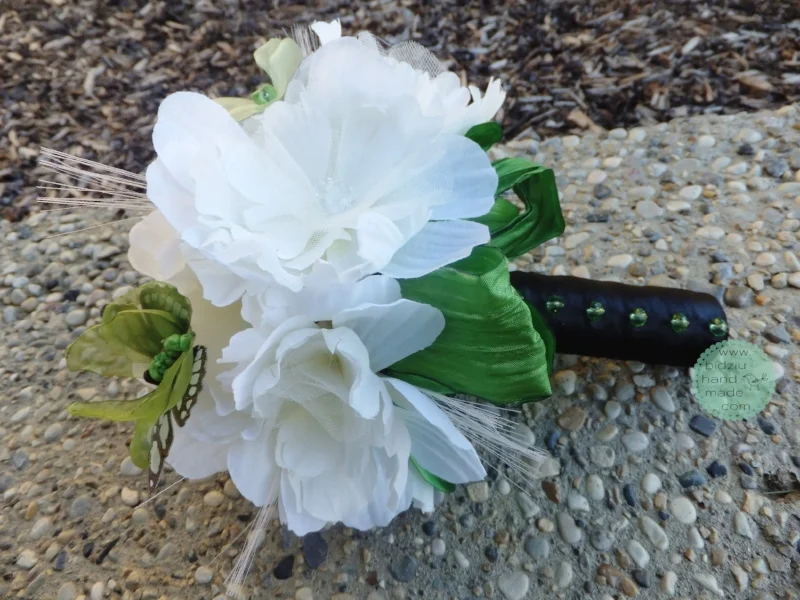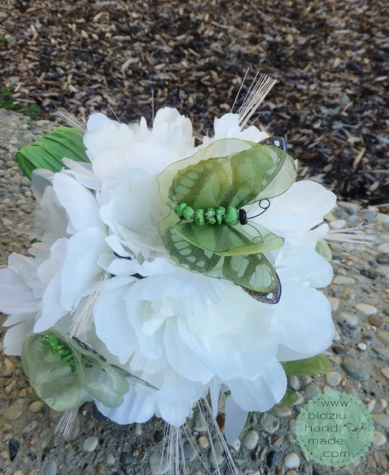 Another bouquet that I had created as part of a series of accessories for an apple green and black themed wedding, this time for a sweet little flower girl. Big, blooming ivory faux flowers, soft butterflies, apple green and black accents, this bouquet is classic and elegant.